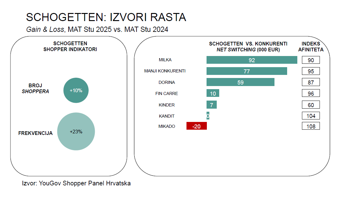 Zanimljiv je slučaj Schogettena koji povećava broj shoppera, ali i frekvenciju kupovine. Gain & Loss analiza pokazuje razmjenu vrijednosti s drugim markama. U apsolutnom iznosu Schogetten dobiva najviše od Milke, manjih konkurenata i Dorine, ali istovremeno gubi dio vrijednosti od Mikada koji je također značajno povećao broj shoppera. Pritom je vrijednost koju Schogetten razmjenjuje s Mikadom iznadprosječna, što ukazuje na viši afinitet kupaca Schogettena prema Mikadu.