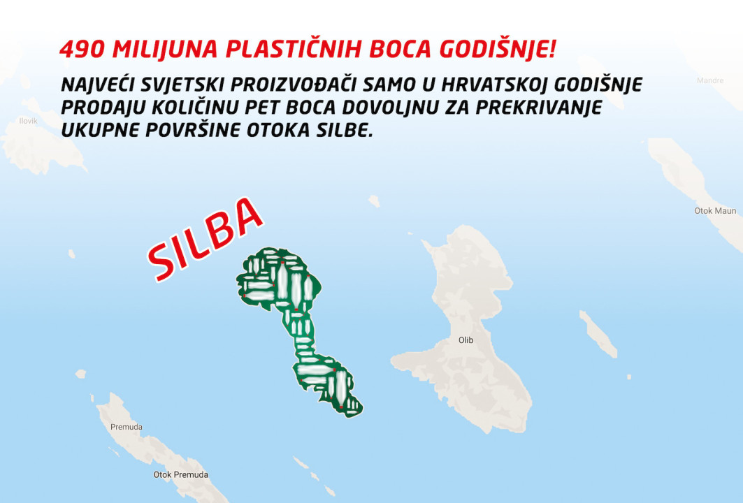 Prema podacima UN-a svake minute proda se milijun plastičnih boca vode, godišnje se proizvede pet milijardi plastičnih vrećica za jednokratnu upotrebu te milijuni tona plastičnih čepova, posuda za šampone, plastičnog pribora za jelo… – ukupno 300 milijuna tona nerazgradivog otpada od čega osam milijuna završi u moru. Prošle godine na tržište Hrvatske, prema podacima Fonda za zaštitu okoliša i energetsku učinkovitost, plasirano je 489.896.247 plastičnih PET bočica, a navedenom količinom PET bočica moguće je prekriti ukupnu površinu otoka Silbe.