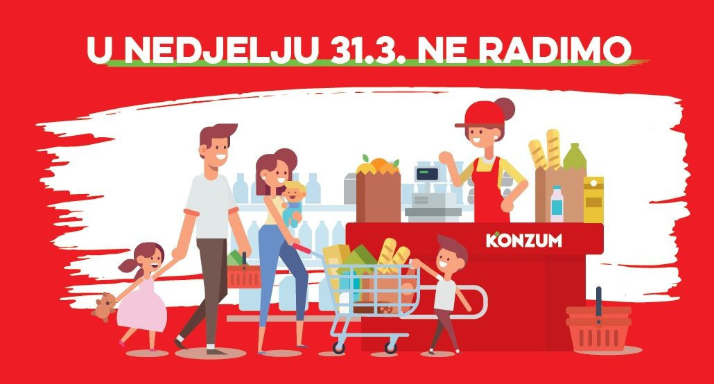 Zbog složenosti prenošenja poslovnih procesa u novo poduzeće te u želji da se zaposlenicima olakša provedba radnji potrebnih prije 1. travnja, Konzumove prodavaonice bit će zatvorene u nedjelju 31. ožujka. U subotu 30. ožujka prodavaonice će raditi po redovnom radnom vremenu ili najkasnije do 21 sat za one koje inače rade dulje.