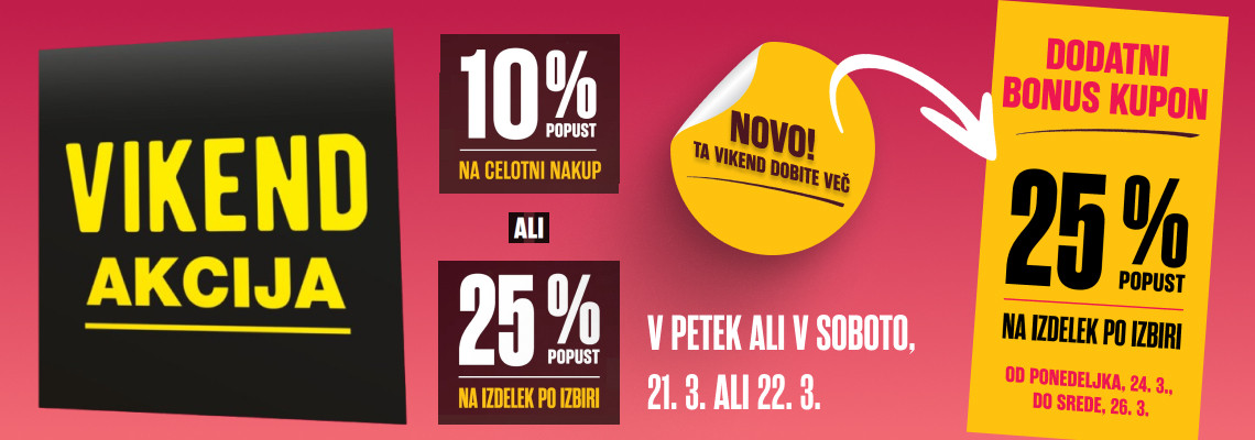 Tak sistem je bil minuli in bo tudi naslednji vikend, a tudi z dodatno ponudbo možnosti 25% popusta na izbrani posamezni izdelek od ponedeljka 24. do srede 26.marca.