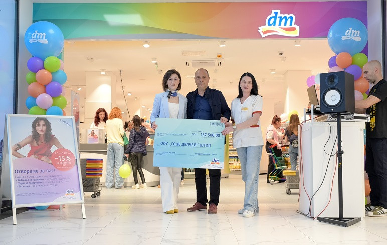 Kot družbeno odgovorno podjetje, katerega načela delovanja globoko vnašajo družbeno odgovornost in ki pomaga okolju, v katerem deluje, je dm ob ponovnem odprtju doniral 137.500 denarjev Osnovni šoli "Goce Delchev" v Štipu.