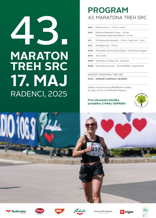 Na maratonsko soboto, 17. maja, se v Radencih obeta pravi tekaški praznik. 43. Maraton treh src bo znova povezal Radence in sosednjo avstrijsko občino Bad Radkersburg, udeleženci pa bodo lahko izbirali med štirimi tekaškimi razdaljami (5, 10, 21 in 42 km), nordijsko hojo, otroškimi teki, tekom s kužki, novim Tekom treh src ter Pohodom treh src.
