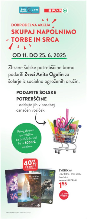 Po podatkih Zveze Anita Ogulin se je število družin, ki so potrebovale pomoč pri nakupu šolskih potrebščin, v zadnjem letu podvojilo. Leta 2023 so za šolo opremili 215 otrok in mladostnikov, leta 2024 je ta številka poskočila na 435. V želji, da bi osnovnošolcem iz manj spodbudnih okolij širom Slovenije olajšali prve šolske dni, so se v podjetju Spar Slovenija odločili, da organizirajo zbiranje šolskih potrebščin v svojih trgovinah. Dobrodelna akcija bo potekala med 11. in 25. junijem 2025 v vseh trgovinah Spar in InterSpar, kjer bodo kupci lahko za osnovnošolce socialno šibkih družin podarili izdelke v posebej označene vozičke. Za čas dobrodelne akcije so v Sparu pripravili tudi ugodno ponudbo zvezkov lastne blagovne znamke Spar Office, da olajšajo odločitev vsem, ki želijo sodelovati v dobrodelni akciji.