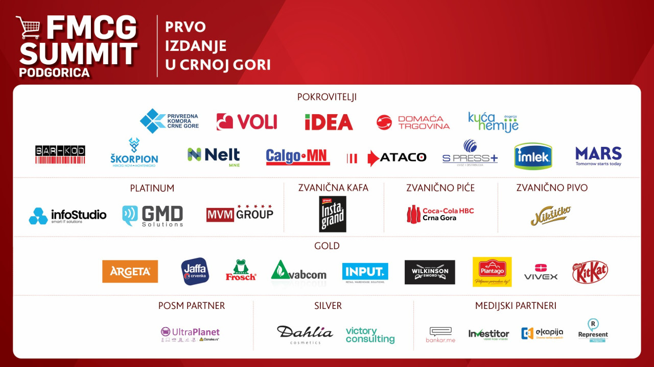 Zahvaljujemo se sponzorjem in partnerjem, ki so podprli 1. FMCG Summit Podgorica, s sporočilom, da bo dogodek prihodnje leto zbral še več voditeljev in postal tradicionalno stičišče za FMCG skupnost regije.