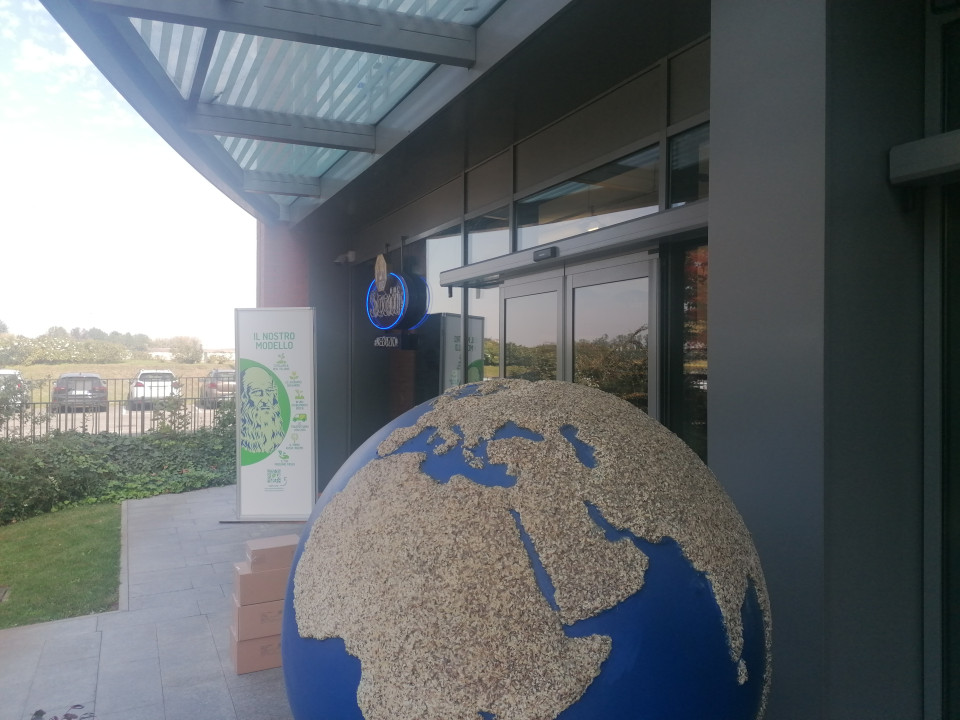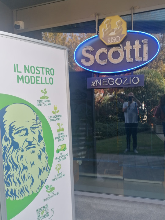 Minoia nam je predstavil tudi starejšega gospoda in enega izmed solastnikov podjetja, kmeta Massima, ki nas je odpeljal do njive, kjer je s kombajni potekala žetev Venere, omenjene »zvezde« zadnjega poglavja v bogati zgodovini zgodbe Riso Scotti, ki samo na sedežu podjetja v Pavii zaposluje skoraj 400 ljudi. Pred velikimi proizvodnimi poslopji in sedežem podjetja, kjer riž pridelujejo povsem trajnostno, kar pomeni brez vseh zavrženih odpadkov in to vseh 365 dni v letu (vsak dan minimalno 10 ton), je tik ob okrasnem mlinu na vodi, skoraj petmetrski kip glave znanstvenika Leonarda Da Vincija.
