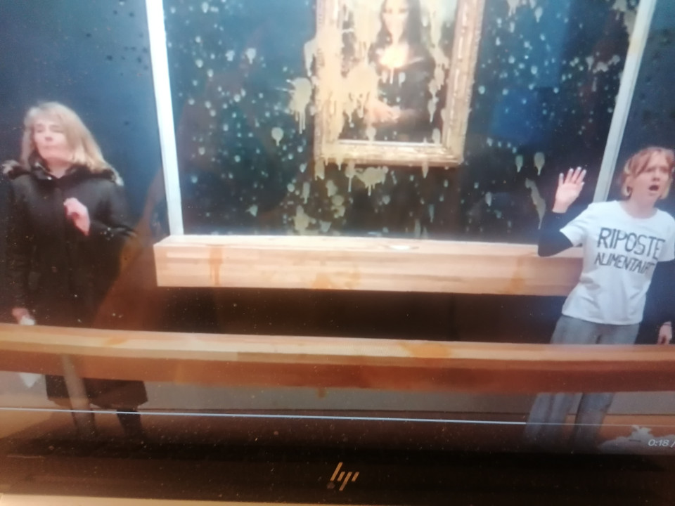 Okoljski protestnici sta slovito Mono Lizo v Louvru poškropili iz plastenk z rumenkasto juho, a slika je ostala nedotaknjena in ohranjena za neprebojnim steklom in ni bila poškodovana. Opozorilo protestnikov njune organizacije se glasi:"Pravica do zdrave in trajnostne hrane!"