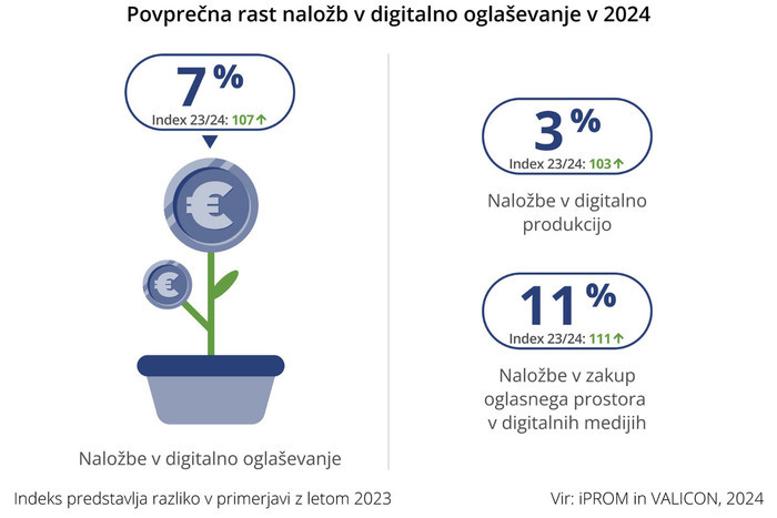 V povprečju bodo naložbe v zakup oglasnega prostora v digitalnih medijih zrasle za 11 odstotkov, naložbe v produkcijo vsebin za digitalne medije pa za tri odstotke. Raziskavo sta družbi izvedli med novembrom 2023 in januarjem 2024, v njej pa je sodelovalo 117 slovenskih odločevalcev na področju oglaševanja in trženja. Družbi raziskavo izvajata že od leta 2019 na osnovi iste metodologije, kar omogoča primerjavo rezultatov in spremljanje trendov na področju digitalnega oglaševanja v Sloveniji.