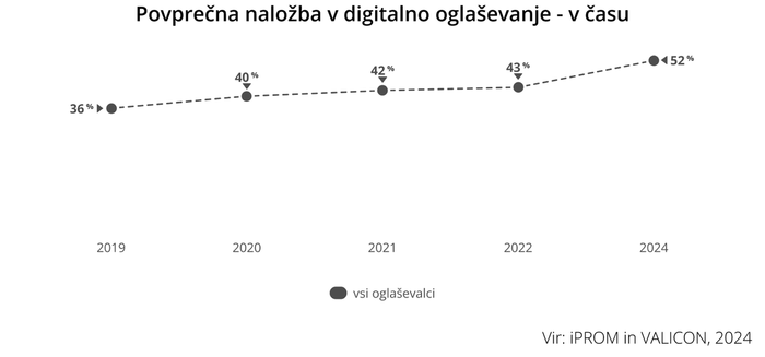 V zadnjih petih letih delež naložb v digitalno oglaševanje kontinuirano narašča in po napovedih odločevalcev za trženje v Sloveniji v povprečju dosega že 52-odstotni delež oglaševalskega proračuna za leto 2024.