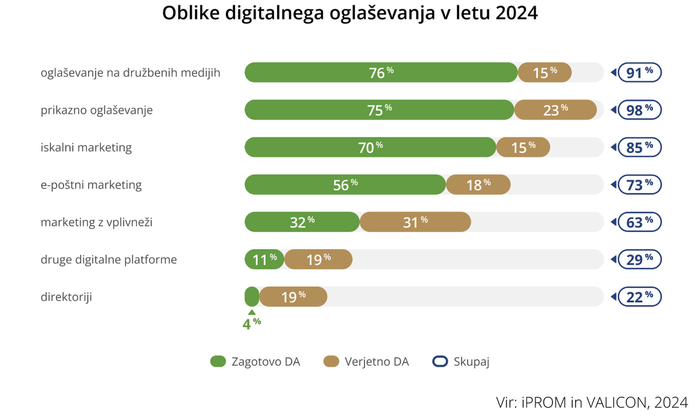 Vsi oglaševalci, ki bodo v letu 2024 sredstva namenili digitalnemu oglaševanju, se bodo v največji meri posluževali prikaznega oglaševanja (98 %) in oglaševanja na družbenih medijih (91 %). Iskalni marketing bo v svoje digitalne oglaševalske strategije vključilo 85 odstotkov anketiranih, e-poštni marketing 73 odstotkov, marketing z vplivneži pa bo izvajalo 63 odstotkov slovenskih oglaševalcev, kažejo povprečni rezultati raziskave iPROMa in Valicona.
