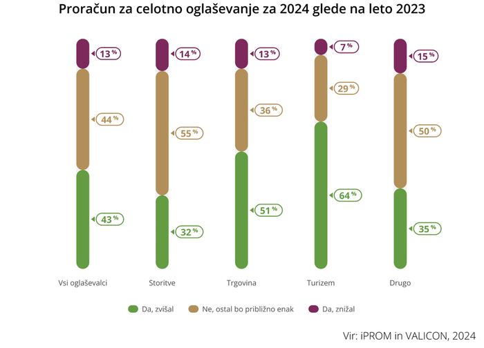 Slovenski oglaševalci bodo po napovedih odločevalcev za trženje v letu 2024 povečali naložbe (43 %) ali ohranili lanskoletno raven naložb (44 %) za celotno oglaševanje. Največje povečanje naložb za oglaševanje bo po napovedih v panogah turizem (64 % ) in trgovina (51 %), medtem ko bodo oglaševalci iz panoge storitve v največji meri ohranili oglaševalske proračune na enaki ravni kot v preteklem letu. Podoben trend s 50 odstotki oglaševalcev, ki ohranjajo raven naložb v 2024, izkazuje tudi panoga drugo.