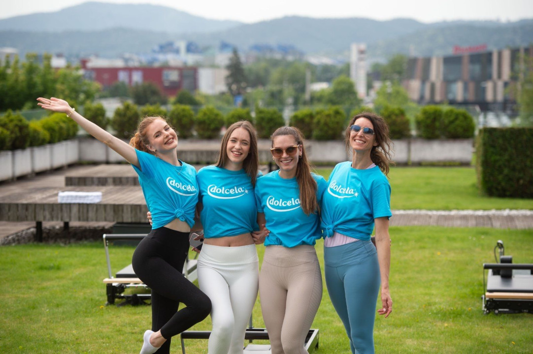 Prijetno druženje na zeleni terasi ljubljanske Kristalne palače v družbi Nives Orešnik, ki je vodila jutranje razgibavanje na pilates reformer napravah, se je nadaljevalo s predstavitvijo novih izdelkov Dolcela HI PROTEIN (Vanilla cake shake in Mug cake).