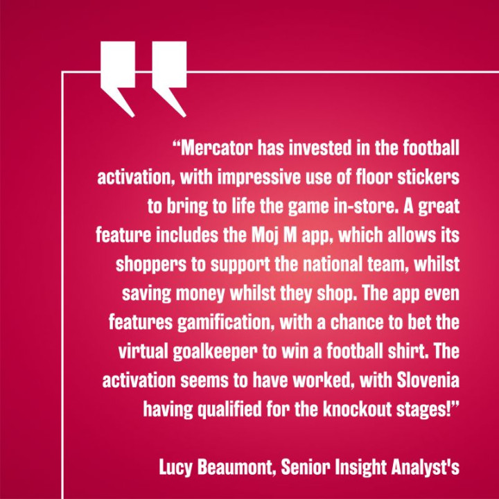 Lucy Beaumont, višja analitičarka pri Insight, je pohvalila Mercator z besedami: "Mercator je z impresivno uporabo talnih nalepk in gamifikacije preko aplikacije Moj M uspel ustvariti edinstveno izkušnjo za svoje kupce, ki ne omogoča le navijanja za reprezentanco, temveč tudi prihranke pri nakupih."