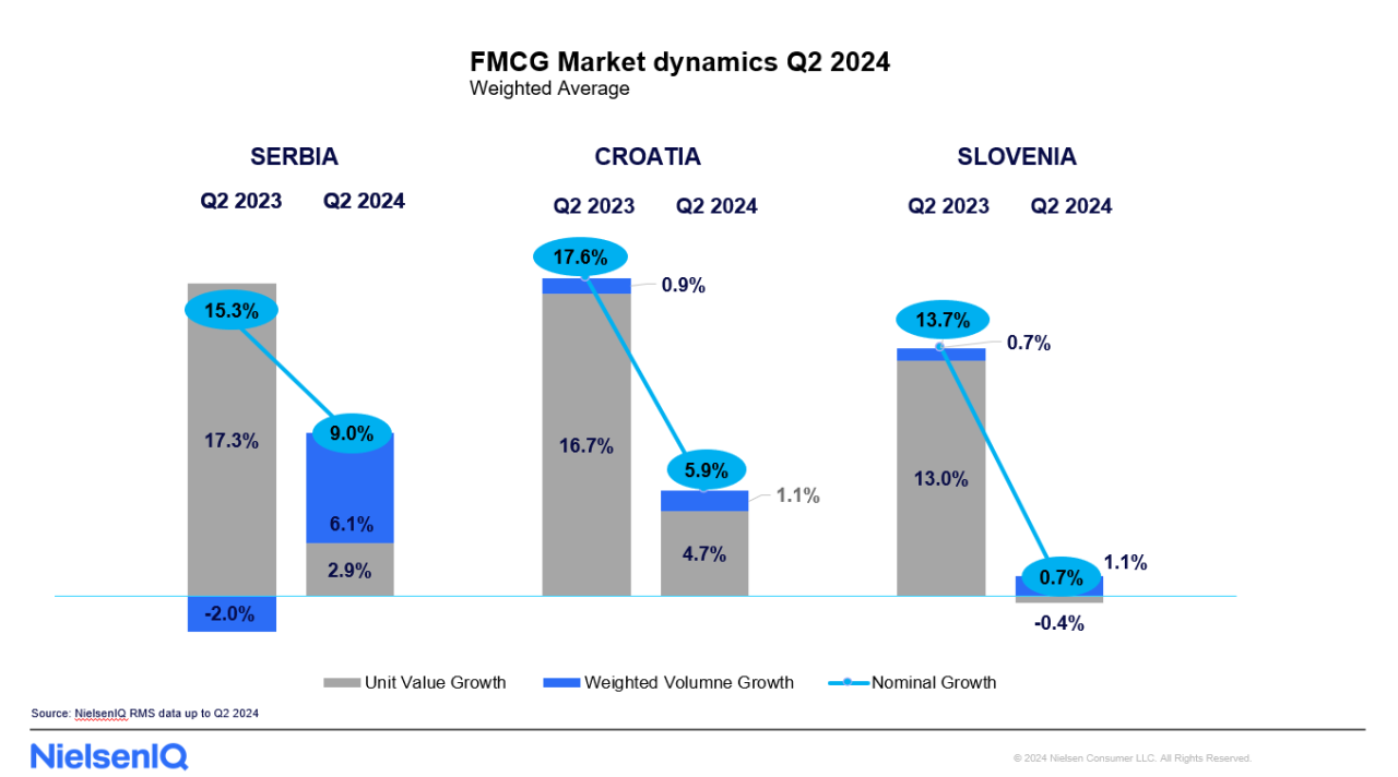 V Srbiji se je v drugem četrtletju 2024 v primerjavi z drugim četrtletjem lani skupna prodaja izdelkov široke potrošnje (FMCG) povečala za 9,0% vrednostno, kar je posledica tako večjega obsega potrošnje (6,1%) kot tudi višjih cen (2,9%). V skladu z upočasnitvijo inflacije v začetku leta je prišlo do opaznih sprememb v nakupnih navadah potrošnikov, pri čemer so največjo rast zabeležile kategorije, ki ne sodijo v osnovni asortiman, in sicer izdelki v kategoriji lovilcev barv, vlažilnega toaletnega papirja, ruma, energijskih pijač in tonikov za obraz.