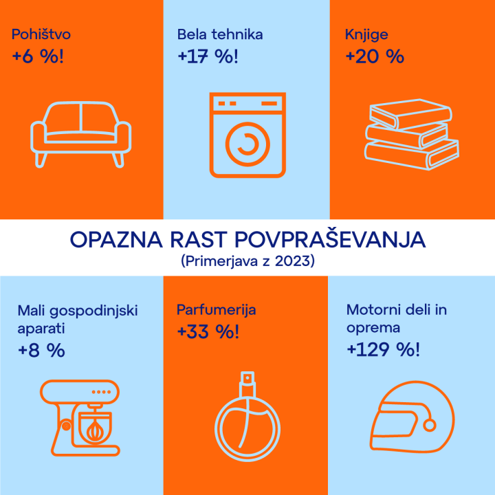Opažamo, da so slovenski kupci v letu 2024 bolj kot v 2023 prenavljali svoje domove, saj se je povpraševanje znotraj kategorije Pohištvo povečalo za 6 %. Rast v kategoriji Knjige za kar 20 % pa morebiti namiguje na ponovni vzpon bralne kulture. Na drugi strani pa tudi Gospodinjski aparati za 17 % kot tudi Mali gospodinjski aparati, kot so cvrtniki in kavni aparati, kjer se je povpraševanje povečalo za 8 %. Parfumerija je tudi doživela razcvet z impresivno 33 % rastjo. Izpostavili bi še kategorijo Motorni deli in dodatki, saj se je avtomobilski sektor več kot očitno zelo razmahnil v tem letu, z neverjetno 129-odstotno rastjo.