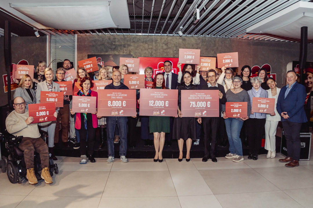 Velika donatorska akcija Srčna soseska je doživela izjemen uspeh, saj je povezala več kot 381.000 glasov Mercatorjevih kupcev, ki so izbrali izdelke z oznako Srčna soseska in oddali svoj glas za izbrano prostovoljno društvo. Vrhunec projekta je bilo srečanje s predstavniki 20 prostovoljnih društev iz vse Slovenije, kjer so predsednik poslovodstva Mercatorja Tomislav Kramarić (na fotografiji zgoraj levo) in direktorica sektorja za tržno komuniciranje in medije Andreja Zadnik Andoljšek predali donatorske čeke.