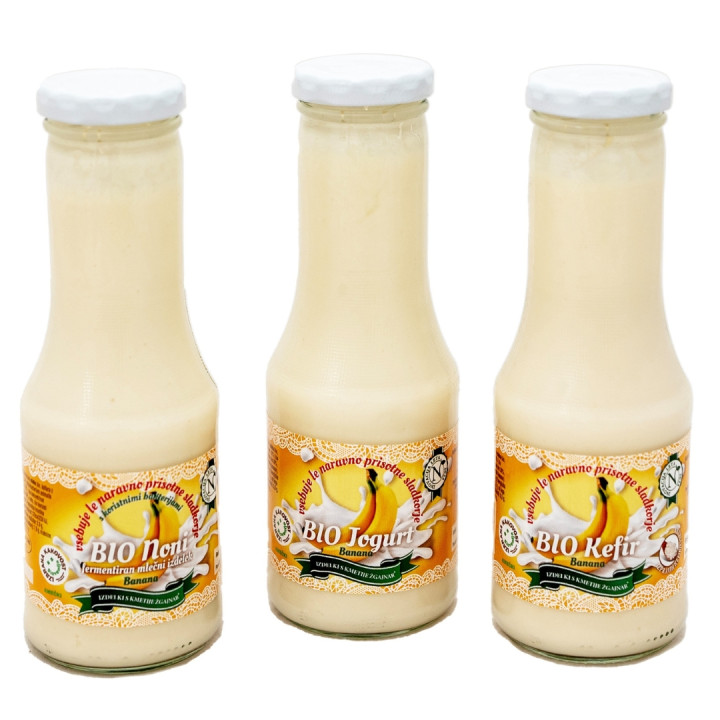 Linijo mlečnih izdelkov z bananinim pirejem podjetja Bio dobrote predstavljajo trije izdelki: jogurt, kefir in fermentiran mlečni izdelek Noni. Vsi trije izdelki so izdelani iz mleka pridelanega na slovenski ekološki kmetiji Žgajnar in navdušujejo s polnim sadnim okusom in privlačno teksturo. Izdelke odlikuje ugodna hranilna sestava v primerjavi s podobnimi izdelki na tržišču, saj vsebujejo zmerno količino sladkorja in tako predstavljajo dobro izbiro v skupini mlečnih izdelkov z okusom.