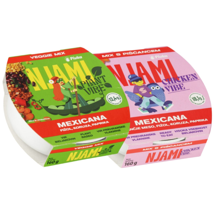 Njami konzervirani solati Mexicana sta praktičen in hranljiv obrok z rahlo pikantnim okusom, na voljo v dveh različicah: mesni (s piščančjim mesom) in rastlinski (z veganskimi sojinimi beljakovinami). Izdelka vsebujeta obilico zelenjave in stročnic, kot so rdeči fižol, korenje, koruza ter rdeča paprika. Glavni vir beljakovin v mesni različici je kakovostno piščančje meso, medtem ko rastlinsko različico odlikujejo sojini trganci. Solati sta bogati z beljakovinami in sta tudi vir prehranskih vlaknin, zaradi česar sta odlična izbira za hitro malico ali obrok na poti.