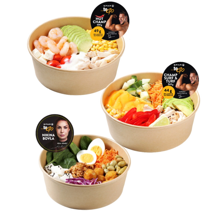 Podjetje Spar Slovenija je svojo linijo pred pripravljenih obrokov SPAR To Go razširilo s tremi novimi solatami, ki predstavljajo okusne in hranljive obroke za vse okuse. Solata Champ predstavlja svež beljakovinski obrok s piščančjimi trakci in kozicami ter raznovrstno zelenjavo, ki jo popestri česnov preliv. Za večji apetit je na voljo solata Hot Champ, ki poleg piščanca vsebuje tudi riž, obilico sveže zelenjave in pekoč preliv z ravno pravšnjo stopnjo pikantnosti. Novost je tudi Nikina bovla, sestavljena iz puhastega riža, hrustljavega piščanca in raznolike zelenjave, povezane s posebno omako. Vse solate izstopajo po bogati vsebnosti zelenjave in polnem okusu. Nikina bovla predstavlja vir beljakovin medtem ko se solati Champ in HOT Champ ponašata z visoko vsebnostjo beljakovin.