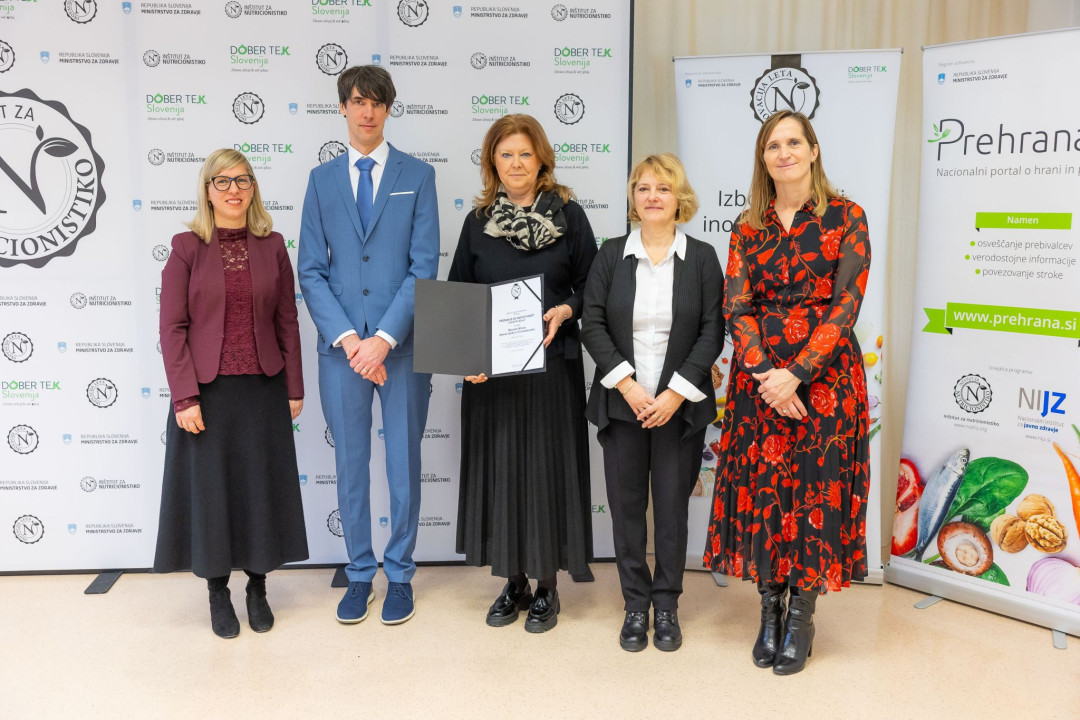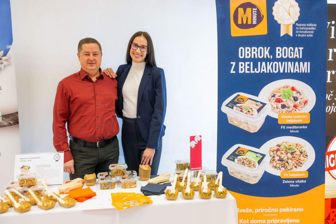 Nagrado je v imenu Mercator IP prevzela članica poslovodstva Katja Mihelič (na fotografiji spodaj v sredini) ob tem pa poudarila pomen ozaveščanja potrošnikov in razvoja hranljivih, trajnostno naravnanih živil. Podelitve sta se udeležila tudi Stevan Kunc, vodja komerciale in Ana Marija Jeras, tehnologinja v Mercator IP (na fotografiji zgoraj), ki sta po podelitvi še podrobneje predstavila nagrajena izdelka.