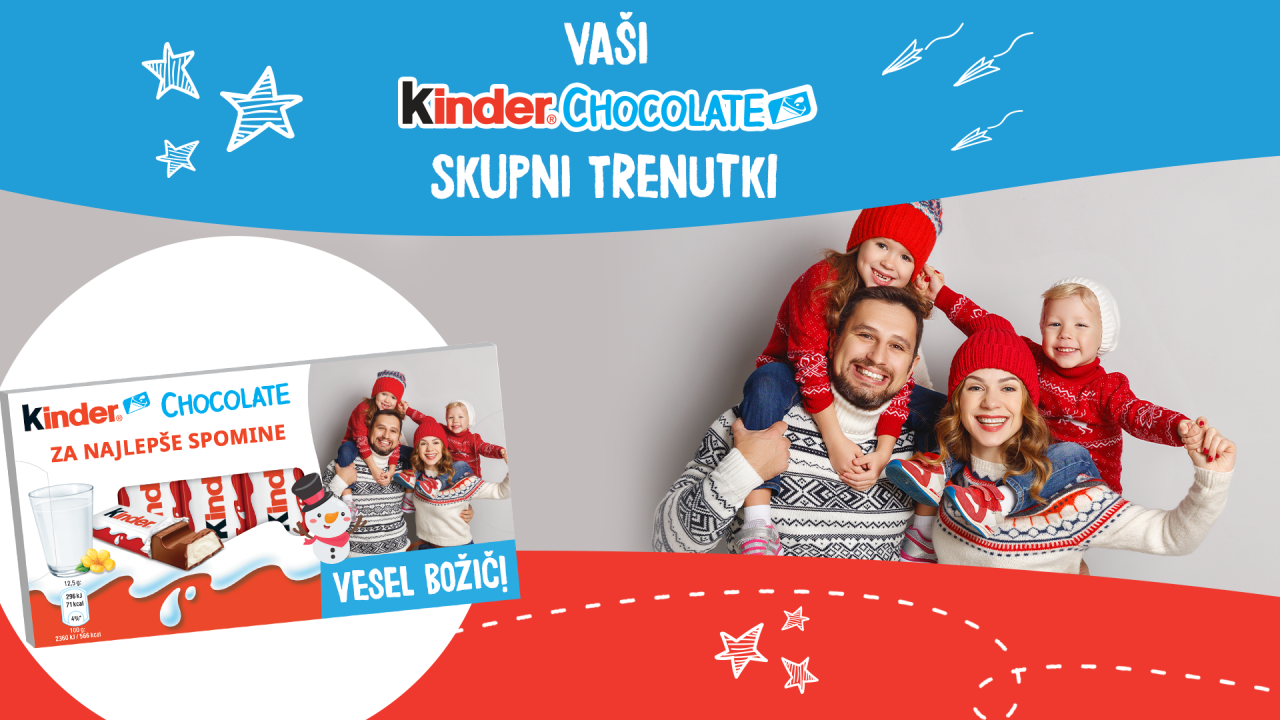Kinder, svetovno znana blagovna znamka čokolade za otroke, v kateri že več kot 50 let uživajo tako odrasli kot otroci, je v prazničnih dneh svoje oboževalce, tudi v Sloveniji, presenetila z možnostjo personalizacije znamenite embalaže. Namesto nasmejanih otroških obrazov na sprednji strani Kinder Chocolatelahko najdete obraz svojega otroka ali kakšne druge vam ljube osebe.