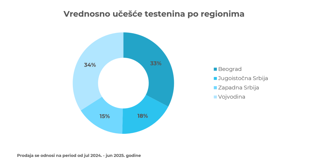 Posmatrano prema regionima Srbije, vrednosna prodaja testenine najveća je u Vojvodini – 34,1%, potom u Beogradu - 32,7%, u jugoistočnoj Srbiji iznosi 17,7%, a najmanja je u centralno-zapadnoj Srbiji - 15,6%.
