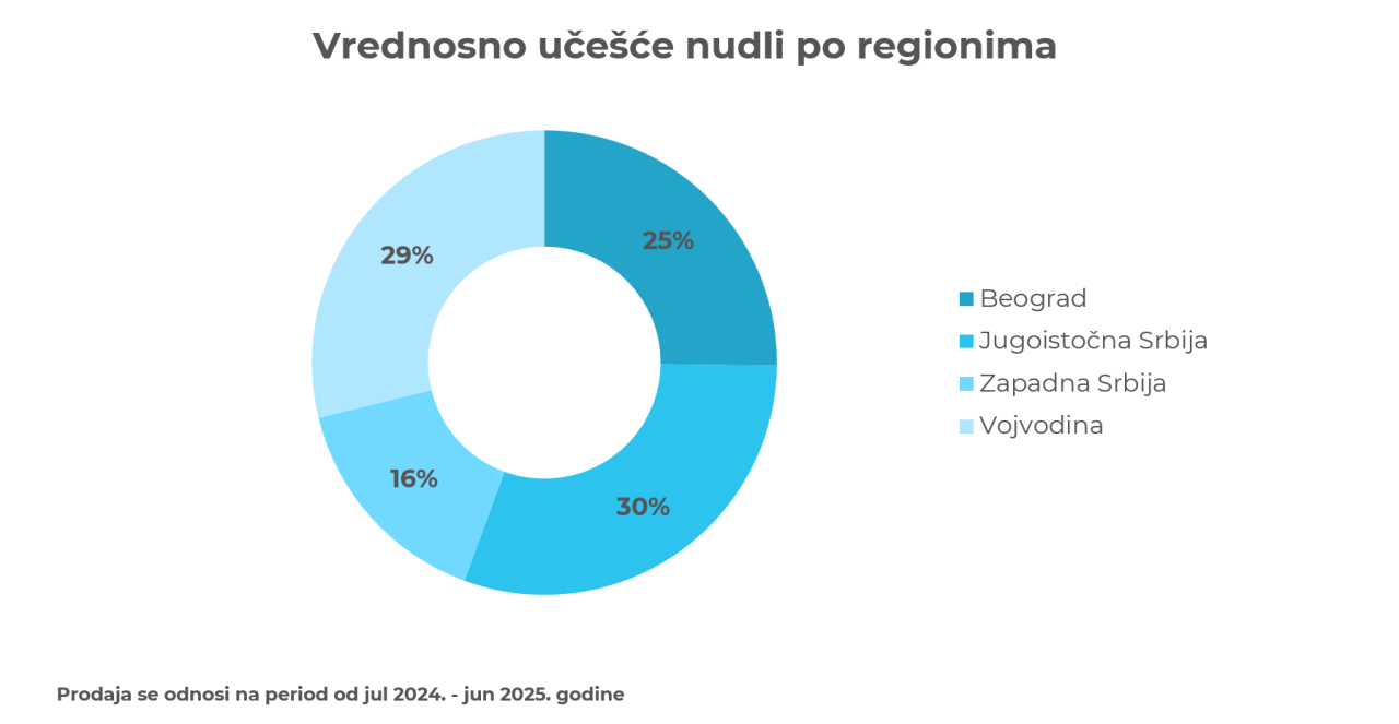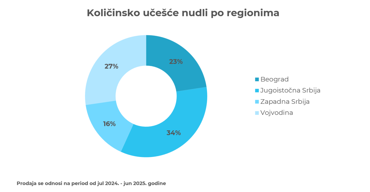 Posmatrano prema regionima Srbije, vrednosna prodaja nudli najveća je u jugoistočnoj Srbiji - 30,4%, potom u Vojvodini – 28,8%, u Beogradu iznosi 25,2%, a najmanja je u centralno-zapadnoj Srbiji - 15,6%.