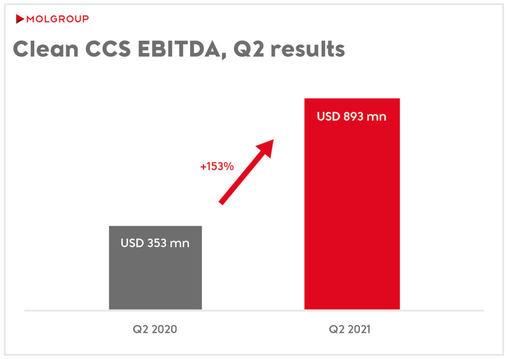 U prvih šest meseci, MOL Grupa je ostvarila EBITDA u iznosu od 1.559 miliona dolara dok je čista CCS EBITDA u drugom kvartalu ostvarila rast od 153% u odnosu na prethodnu godinu i dostigla najviši nivo ikada u vrednosti of 893 miliona dolara, zahvaljujući snažnijem makro okruženju u naftnoj industriji, rekordno visokim maržama petrohemije i popuštanju pandemijskih mera koje su imale pozitivan uticaj na obime prodaje. Snažno povećanje EBITDA u drugom kvartalu omogućilo je MOL Grupi da koriguje smernice za celu 2021. godinu sa „oko 2,3 milijarde dolara“ na „oko 3 milijarde dolara“.