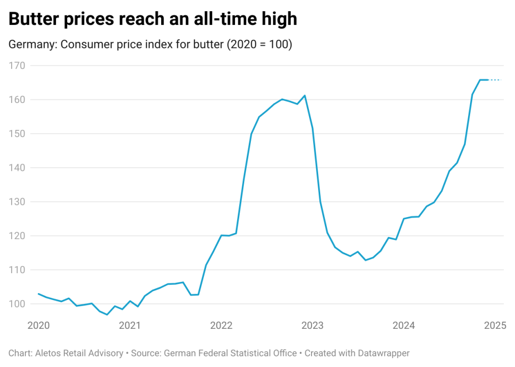 Najupadljiviji primjer je agresivna politika cijena maslaca. Cijena pakiranja od 250 grama skočila je za gotovo 50 % između kolovoza 2023. i siječnja 2025. U veljači 2025. Lidl je snizio cijenu svog privatnog brenda s 2,39 € na 2,25 €, što je prisililo Aldi da reagira i spusti na 2,19 €. Tri tjedna kasnije Lidl je dodatno snizio ispod psihološke granice od 2 € – na 1,99 € – a Aldi, Edeka, Netto, Kaufland, Norma i Penny morali su pratiti.