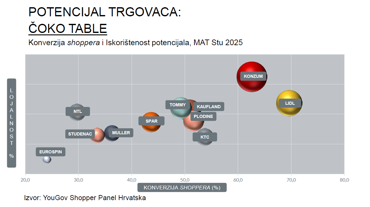 Lidl ima najveću konverziju kategorijskih shoppera (70%), dok je u lojalnosti konvertiranih shoppera na prvome mjestu Konzum. Ako promatramo MAT Studeni 25 u odnosu na prethodni MAT, Plodine i KTC jedini bilježe rast broja shoppera kategorije, dok Konzum, Kaufland, Plodine, Müller i Studenac imaju rast kategorijskog VPE-a.