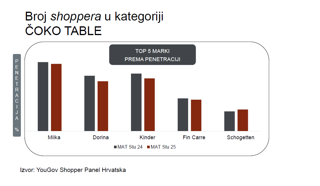 Uz pad penetracije, frekvenciju kupovine i volumena po kupovini, kategorija bilježi količinski pad, ali i vrijednosni rast u razdoblju MAT Studeni 2025. Milka je vrijednosno vodeća među brendovima, a Fin Carre među trgovačkim markama. Među pet vodećih marki prema broju shoppera (Milka, Dorina, Kinder, Fin Carre, Schogetten), Milka se ističe 68%-tnom konverzijom kategorijskih shoppera, ali kao i većina čoko brendova gubi shoppere.