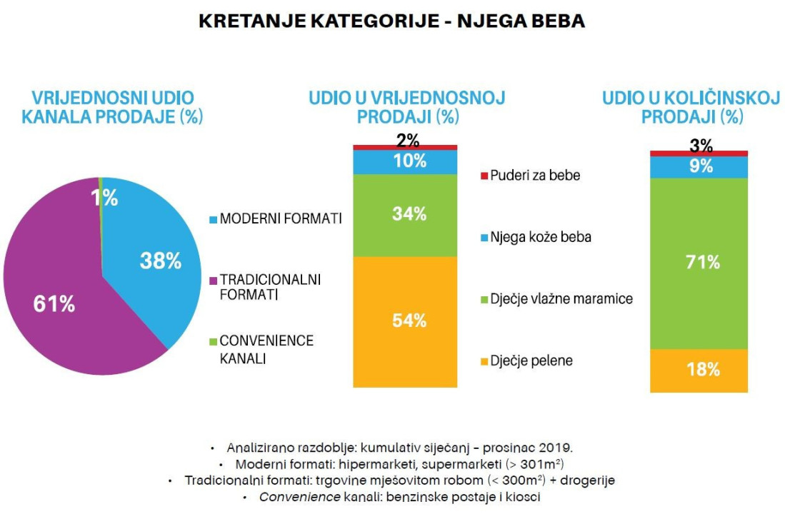 Vrijednosno najznačajniji kanal prodaje su tradicionalni formati, trgovine mješovitom robom (<300m2) i drogerije, te se kroz taj kanal prodaje 61% segmenta njege beba. Kroz moderne formate (hipermarkete i supermarkete) prodaje se 38% segmenta, a oko 1% njege beba pronalazi svoje kupce u kioscima i trgovinama na benzinskim postajama (convenience kanal).