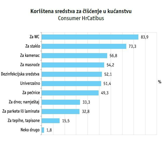 Najviše korištena vrsta sredstava za čišćenje su ona za čišćenje WC-a, koje koristi 83,9% kućanstava. Nešto manji broj kućanstava koristi sredstva za čišćenje stakla (73,3%). U podjednakoj mjeri se koriste sredstva za uklanjanje kamenca (56,8%), masnoća (54,2%), dezinfekcijska (52,1%) i univerzalna sredstva (51,4%) te sredstva za čišćenje pećnice (49,3%). U manjem broju kućanstava koriste se sredstva za čišćenje drva i namještaja (33,3%) te parketa ili laminata (32,8%). Najmanje kućanstava koristi sredstva za pranje tepiha ili tapisona (15,5%).