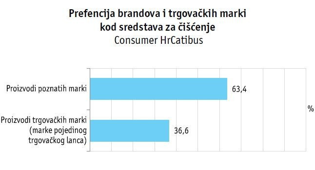 Pri kupnji sredstava za čišćenje većina kućanstava okreće se brandiranim proizvodima (63,4%), dok se u manjem broju kućanstava preferiraju proizvodi trgovačkih marki.