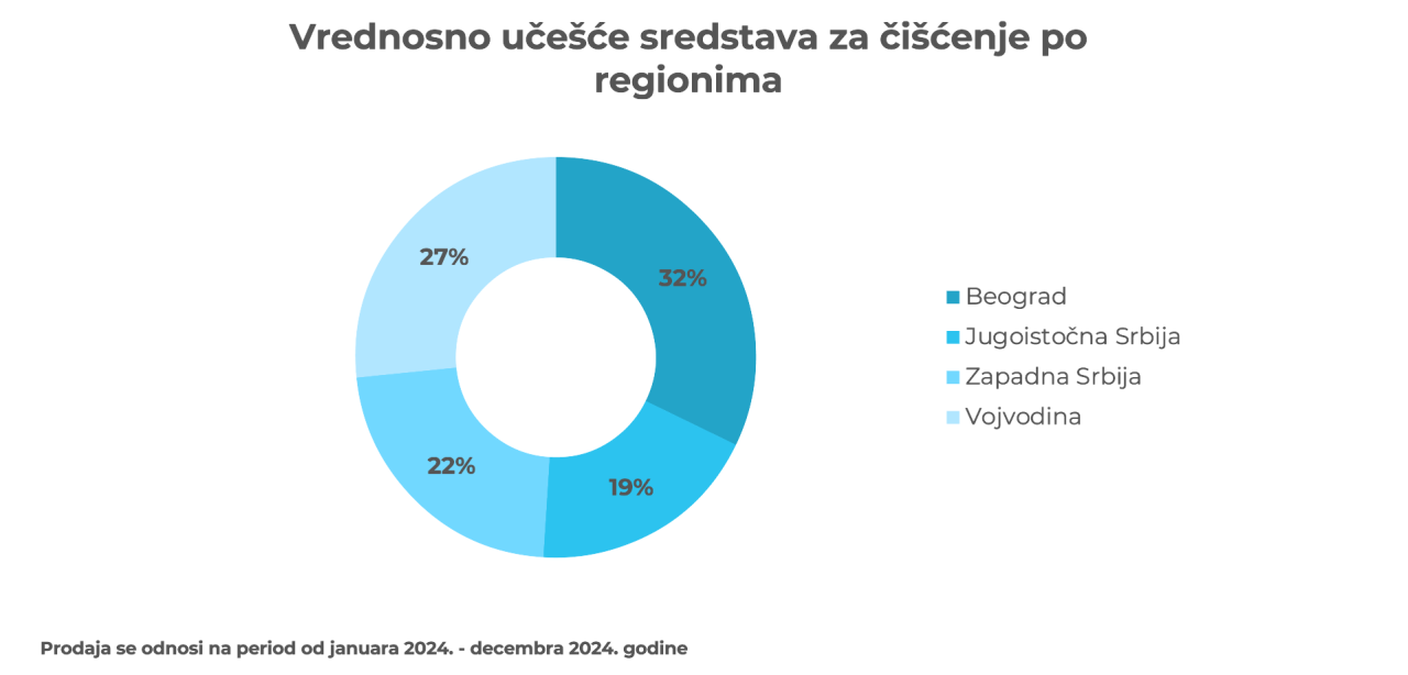 Posmatrano prema udelu prodaje sredstava za čišćenje domaćinstva po regionima, Beograd i Vojvodina vode. Vrednosno učešće u Beogradu iznosi 32,2%, potom sledi Vojvodina sa 26,6%, zapadna Srbija sa 22,4% i jugoistočna sa 18,8%.
