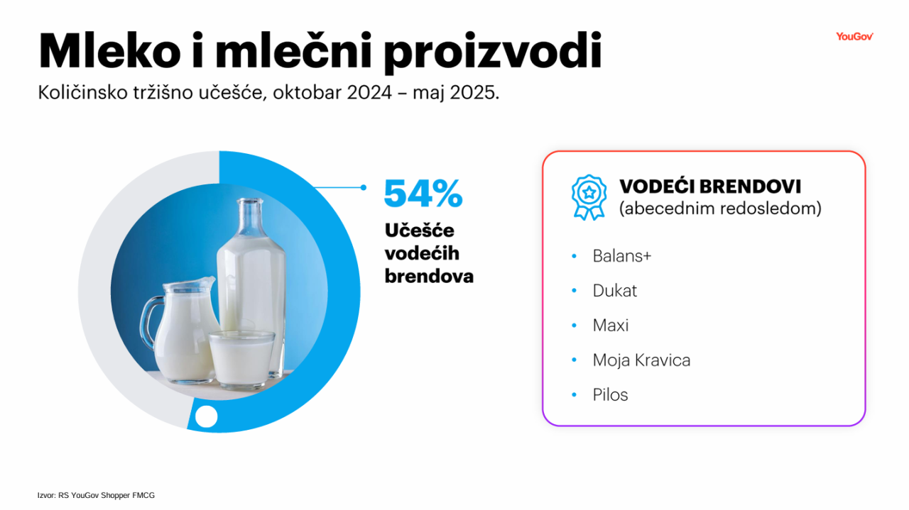 Mleko i mlečni proizvodi su se našli u 25% FMCG korpi namenjenih za potrošnju unutar domaćinstva. Osim toga, broj korpi u kojima su se našli proizvodi iz posmatrane kategorije, opao je za 3% u periodu od oktobra 2024. do maja 2025, u odnosu na period od oktobra 2023. do maja 2024. godine.