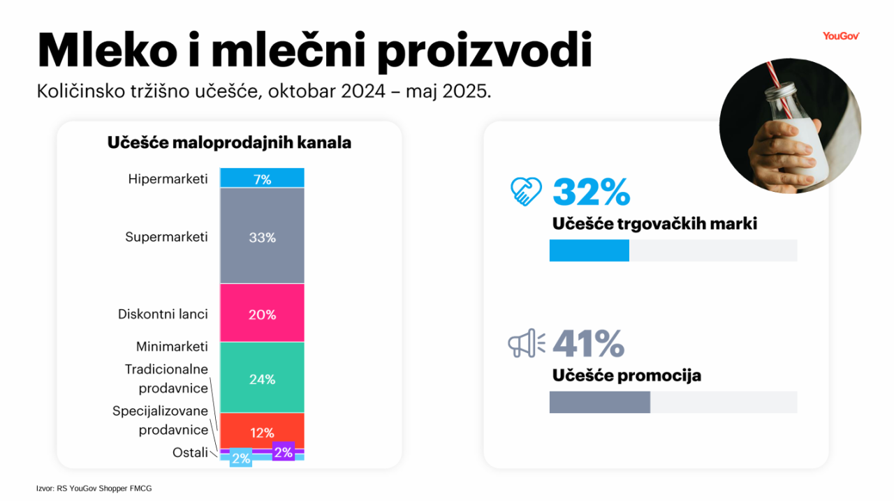 Supermarketi ostaju vodeći maloprodajni format na tržištu mleka i mlečnih proizvoda – oni generišu 33% ukupne kupljene količine analizirane kategorije. Slede minimarketi sa 24% količinskog učešća i diskontni lanci, čiji udeo iznosi 20%. Tradicionalne prodavnice imaju 12%, hipermarketi 7%, a specijalizovane prodavnice 2% učešća.