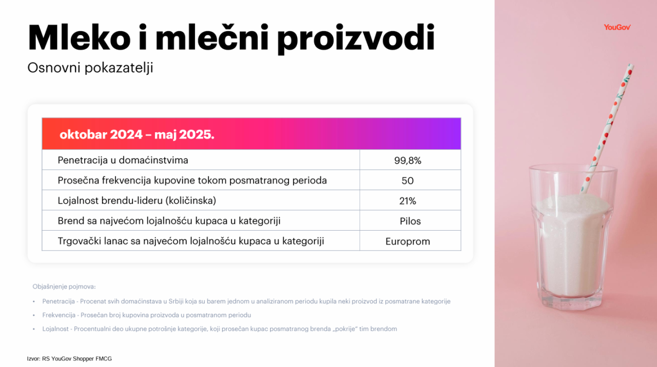 U fokusu ovog istraživanja je kupovina mleka i mlečnih proizvoda u domaćinstvima u Srbiji, u periodu od oktobra 2024. do maja 2025. godine. Navedena kategorija obuhvata mleko, kiselo mleko, mileram, kiselu pavlaku, običan i voćni jogurt i slično.
