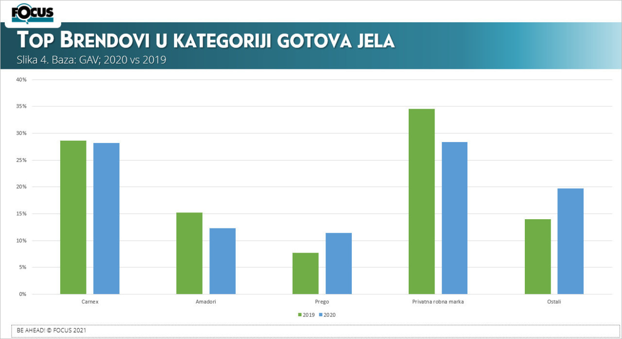 Četvrti dijagram: Za kraj, da spomenemo još i Top brendove u kategoriji Gotova jela. Privatne robne marke, u toj kategoriji, imaju 28% što je za 7% manji udeo od ostvarenog u prethodnoj godini. Prva tri brenda nose polovinu bruto oglašivačke vrednosti. U kategoriji gotovih jela se, pored privatnih robnih marki, oglašavalo još 33 brenda.