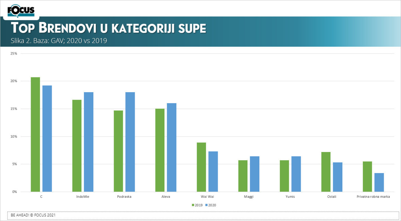 Drugi dijagram (naslovna fotografija) nam prikazuje analizu Top brendova, za kategoriju Supe. Na prvom mestu po vrednosti oglašavanja je brend C, proizvođača Nestlé, koji beleži manji pad u poređenju sa 2019. godinu. Vidimo da su IndoMie, Podravka i Aleva imali rast. Sedam brendova je imalo udeo veći od 90%. Privatne robne imaju u toj kategoriji dosta mali udeo, koji iznosi 3,4%.