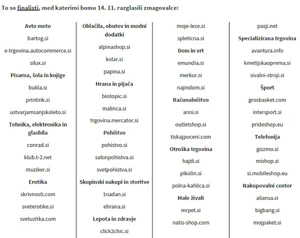 V kategoriji Hrana in pijača so kandidati za zmagovalca leta: www.malinca.si, www,biotopic.si in trgovina.mercator,si. Kandidate v ostalih kategorijah si lahko ogledate spodaj...