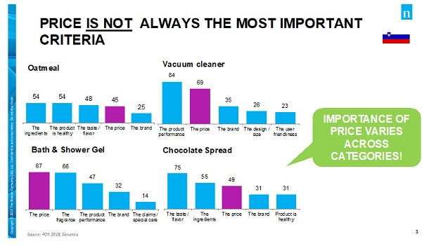 Cena še posebno ni pomembna pri izdelkih hrane in pijače, kjer na prvih mestih kriterijev za nakup prevladujejo okus, sestavine, vpliv na zdravje. Prav nasprotno pa velja pri izdelkih za osebno nego, kjer tudi cena igra pomembno vlogo pri nakupih, poleg drugih dejavnikov kot so vonj, učinkovitost, znamka in drugo.