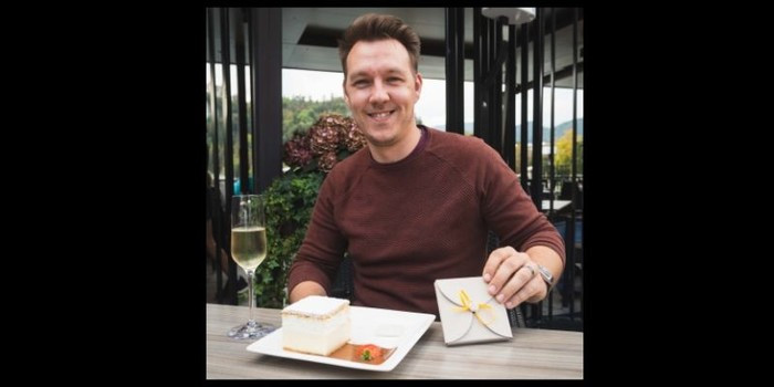 Tomaž (na fotografiji) iz Slovenj Gradca je bil ta srečnež, ki je jubilejno "kremšnito" prejel iz rok direktorice Sava Hotelov Bled Mojce Kraševec. "Vsak dan do konca življenja lahko pride v našo prenovljeno Kavarno Park in ga bo čakala brezplačna kremna rezina," je povedala Kraševčeva.