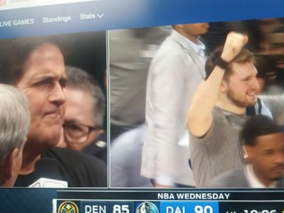 To je bila zadnja tekma Lige NBA pred prekinitvijo zaradi koronavirusa, na fotografiji lastnik Dallasa Mark Cuban (levo), ko je sredi tekmi zvedel za odločitev vodstva lige in desno Luka Dončić, ki je dal 28 točk, 9 podaj in 6 skokov za zmago Dallasa nad Denverjem s 113:97.