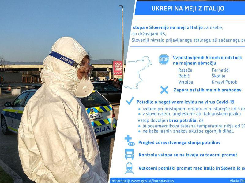 Vstop v Slovenijo je na italijanski meji od srede mogoč samo na šestih nadzornih točkah pod posebnimi pogoji. Skladno z odredbo ministra za zdravje se vstop v Slovenijo dovoli posamezniku, ki ni slovenski državljan oziroma v Sloveniji nima prijavljenega stalnega ali začasnega prebivališča, če predloži dokazilo o opravljenem molekularnem laboratorijskem testu na prisotnost koronavirusa, s katerim izkaže negativen izvid.