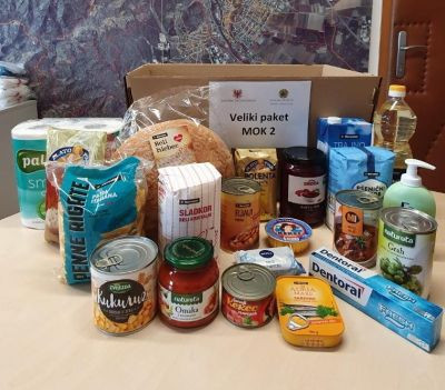 Oblikovali so dva paketa, MOK 1 in MOK 2, ki ju dostavijo prostovoljci. Sredstva za hrano založi MOK (Mestna občina Kranj) in naročniku pošlje račun. Za veliki paket je treba odšteti 26,42 evra.| Mali paket MOK 1 V paketu bo prejemnik dobil mleko, kruh, testenine, omako za testenine, konzervo sardin, kilogram moke, kozarec rdeče pese, pločevinko koruze, goveji golaž, milo, tekoče milo, zobno pasto, toaletni papir. Okvirna vrednost je 16,09* evra. Veliki paket MOK 2 Osnovnih živil v večjem paketu je v okvirni vrednosti 26,42* evra. V njem so olje, sladkor, riž, testenine, polenta, zdrob, goveji golaž, pločevinke graha, fižola in koruze, mesni narezek, pašteta, konzerva sardin, kozarec rdeče pese, omaka za testenine, pakirani kruh, mleko, milo, tekoče milo, zobna pasta in toaletni papir. |