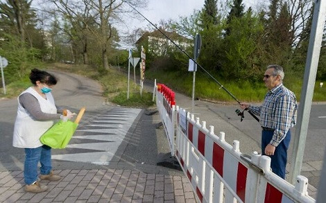Eden izmed stalnih odjemalcev, gospod Hartmut Fey je šel korak dalje in blago prevzel, kot lahko zgoraj vidite, z ribiško palico. "Gre za tradicijo. Naša družina tu kruh kupuje že desetletja. To z ribiško palico je moja ideja, da svetu vseeno pokažem kako ozaveščeni smo glede ohranjanja razdalje," se pohvali Fey. Verjetno si ob nakupu ribiške opreme niti v sanjah ni predstavljal, da bodo prišli časi, ko bo na trnek lovil kruh ...
