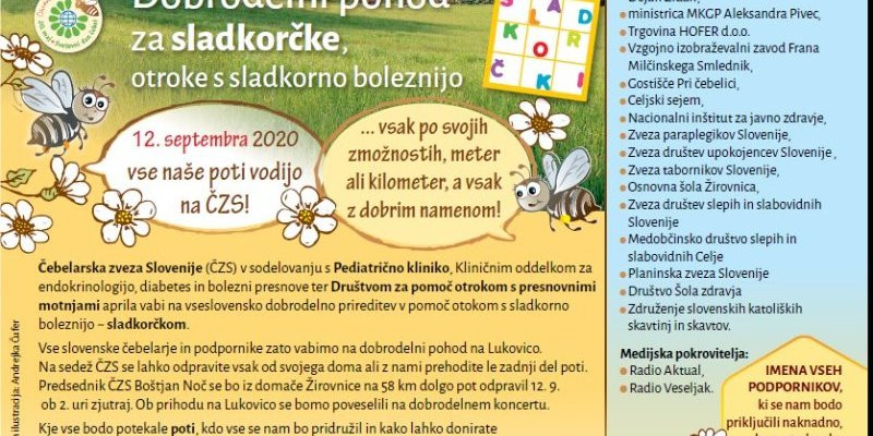 Na Čebelarski zvezi Slovenije (ČZS) so se v sodelovanju s Pediatrično kliniko, Kliničnim oddelkom za endokrinologijo, diabetes in bolezni presnove ter Društvom za pomoč otrokom s presnovnimi motnjami odločili, da v 17.aprila izvedejo vseslovensko dobrodelno prireditev, s katero želijo pomagati sladkorčkom, ki je prestavljena na september.