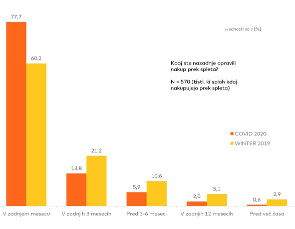 Nadaljnjih 18 % pa je nakup preko spleta opravilo v zadnjih treh mesecih. Med epidemijo je prišlo tudi do nekaj sprememb navad in pogostosti spletnega nakupovanja. Med vprašanimi je največ, kar 59 % takšnih, ki so približno enako preko spleta nakupovali pred in po epidemiji, 12 % jih je pričelo nakupovati pogosteje, 5 % jih je začelo s spletnim nakupovanjem, a ga ponovno opustilo, 5 % pa je postalo novih spletnih kupcev: med epidemijo je začelo s spletnim nakupovanjem in to navado obdržalo.