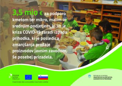 Ministrstvo za kmetijstvo, gozdarstvo in prehrano bo danes v Uradnem listu objavilo javni razpis za ukrep iz Programa razvoja podeželja za obdobje 2014–2020/21.Ministrstvo želi s finančnimi sredstvi podpreti kmetijska gospodarstva ter MSP zaradi izpada prihodka, ki je posledica zmanjšanja prodaje proizvodov javnim zavodom zaradi epidemije covid-19, s ciljem olajšanja njihovih likvidnostnih težav. Vložitev vloge na javni razpis poteka od 9. novembra 2020 do vključno 24. novembra 2020, do 23:59. ure.