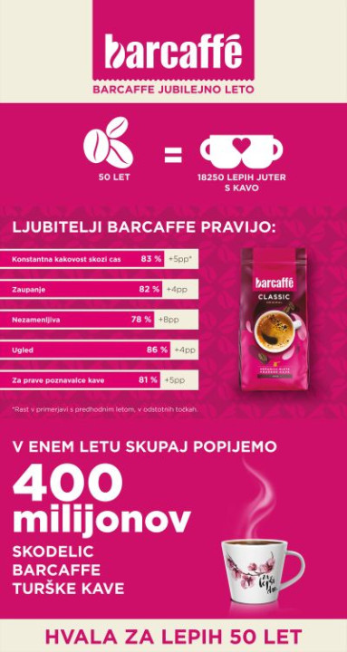 "Ponosni in srečni smo, da je naša kava že 50 let navdih za boljši jutri in povod za začetek nečesa lepega," so za polstoletno zvestobo slovenskih potrošnikov hvaležni pri Barcaffèju.